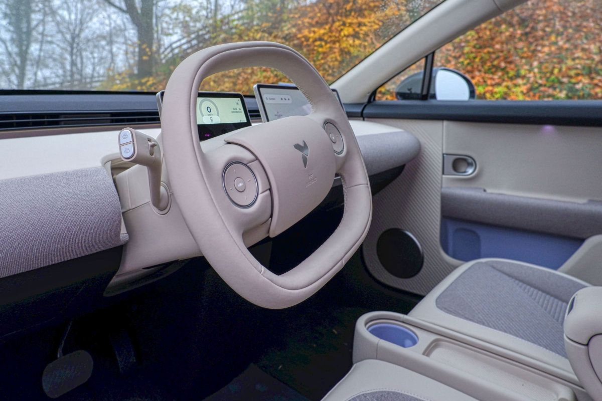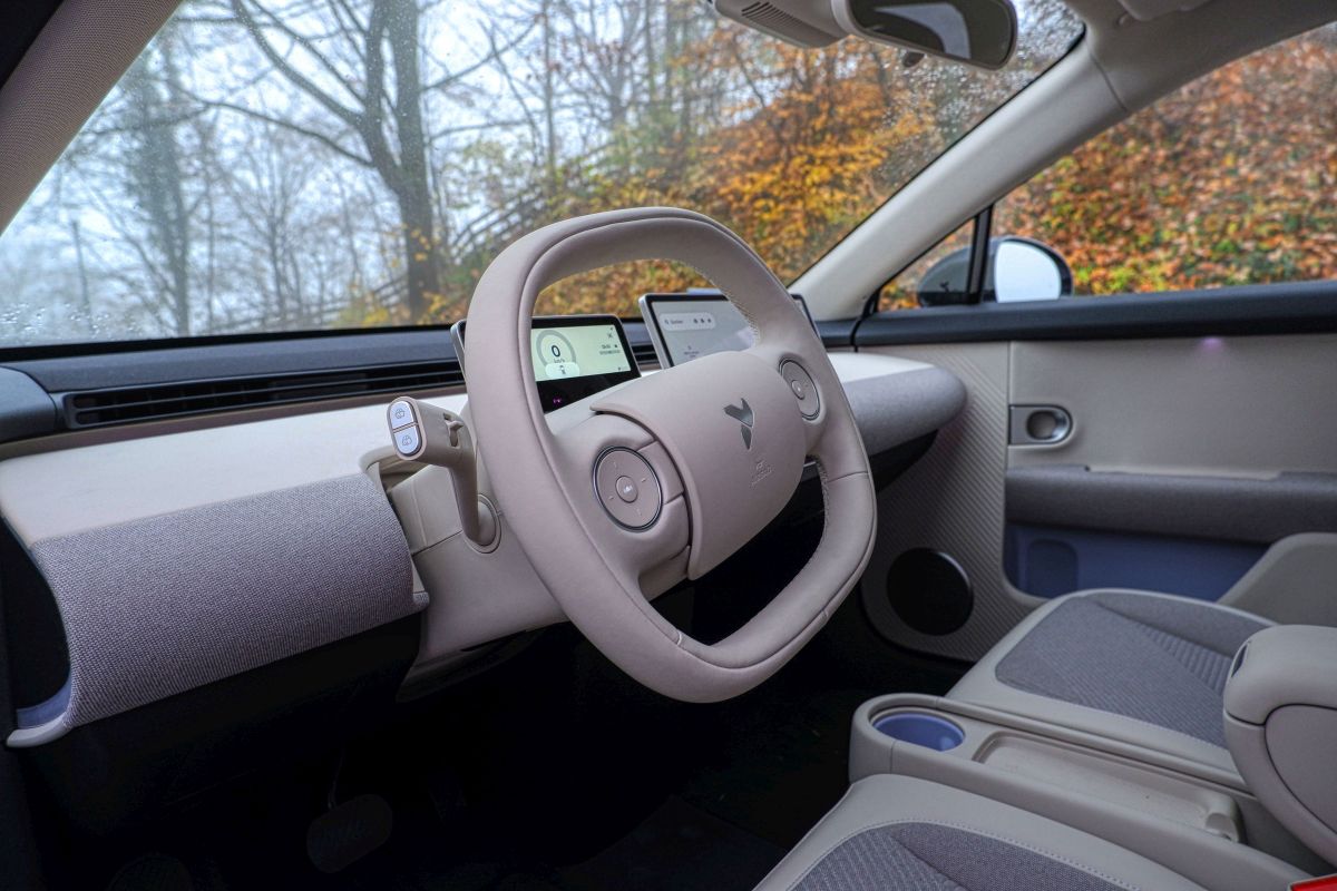 Der Innenraum überrascht mit hellen Farben (keine Sorgen, alternativ gibt es auch dunkle!), einem viereckigen Lenkrad und dem Fehlen der Mittelkonsole. Vor allem aber überrascht er mit einem großartigen Raumangebot. Es ist wirklich unglaublich, wie viel Innenraumbreite die NIO-Ingenieure bei 1781 mm Außenbreite erreicht haben. Ein Renault 5 ist außen gerade einmal 7 mm schmäler, innen aber wesentlich enger.