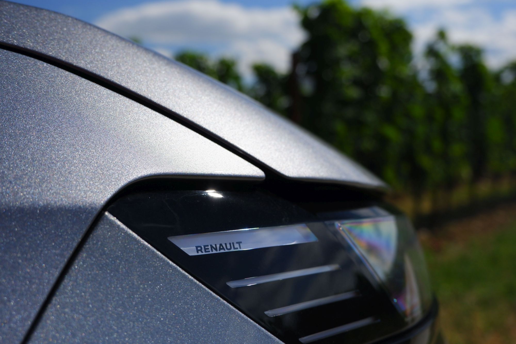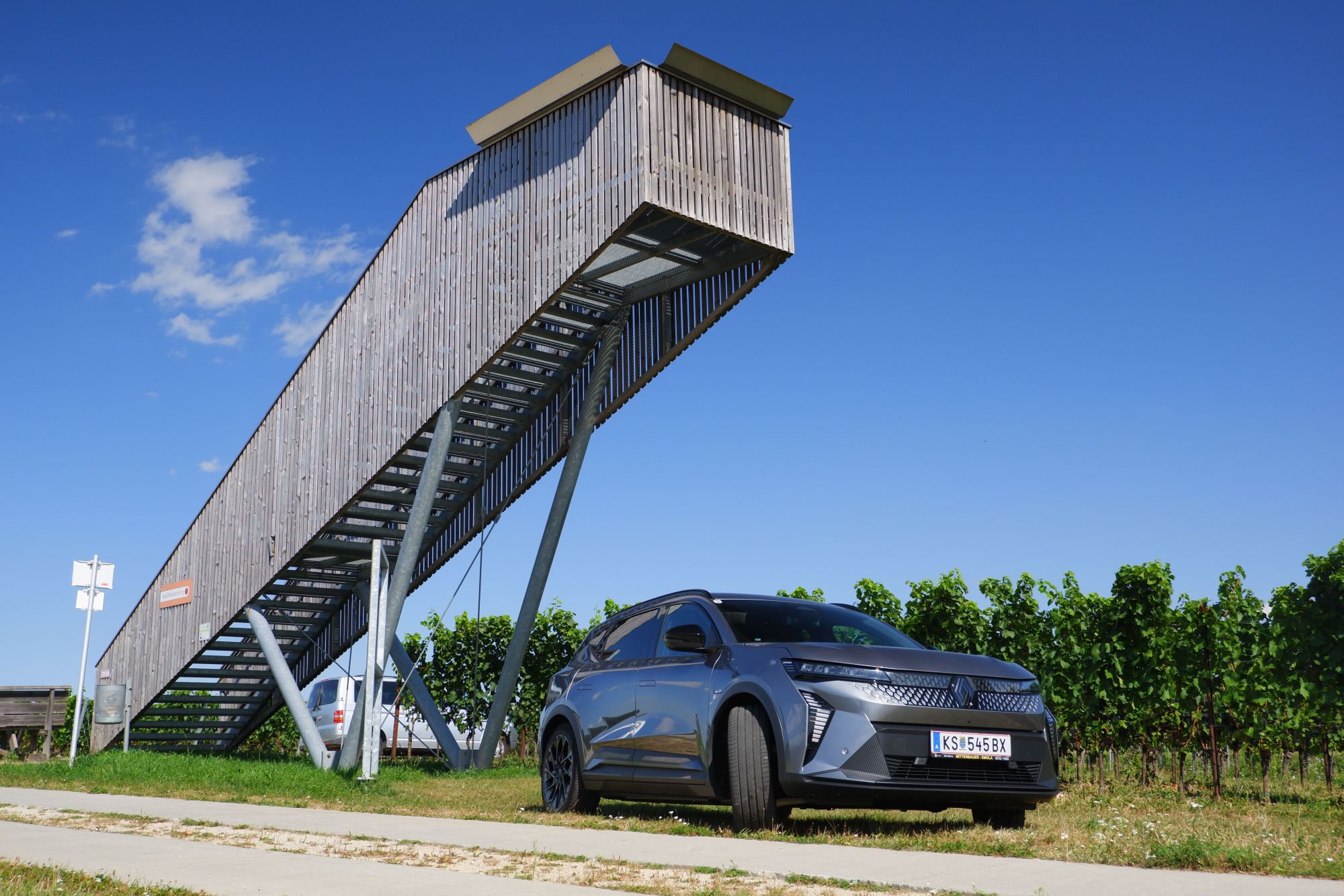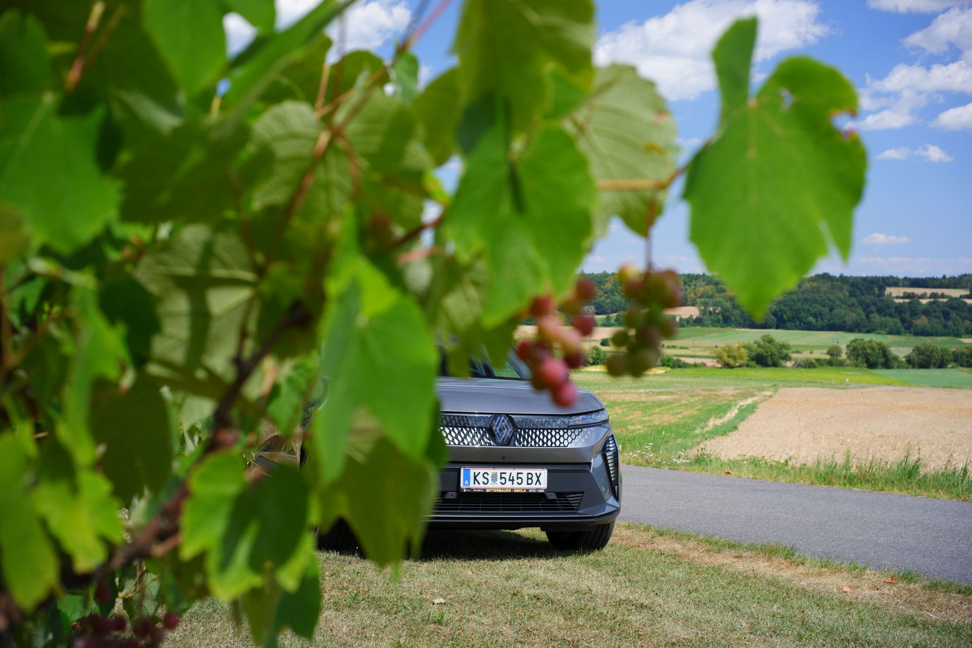 Nach der ersten Wanderung durch die Weingärten des Mittelburgenlands nehme ich mir Zeit, die Karosserie einmal genauer zu betrachten. Ursprünglich ein Kompaktvan auf Basis des Mégane, ist der Scénic der 5. Generation nun eher ein SUV. Ich schreibe jetzt bewusst “eher”, weil dem Scénic im Vergleich zu “richtigen” SUVs wie beispielsweise dem Opel Grandland etwas Bodenfreiheit fehlt, auf den Grandland fehlen ihm auch rund 20 Zentimeter, wovon man zwar beim Einparken viel, im Innen- noch im Kofferraum jedoch wenig merkt.