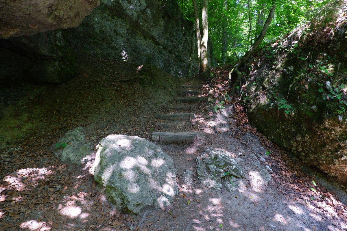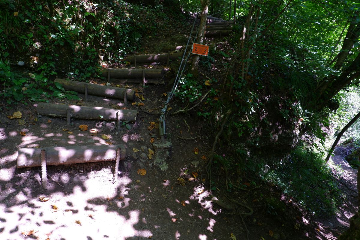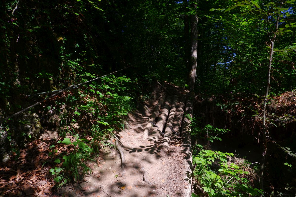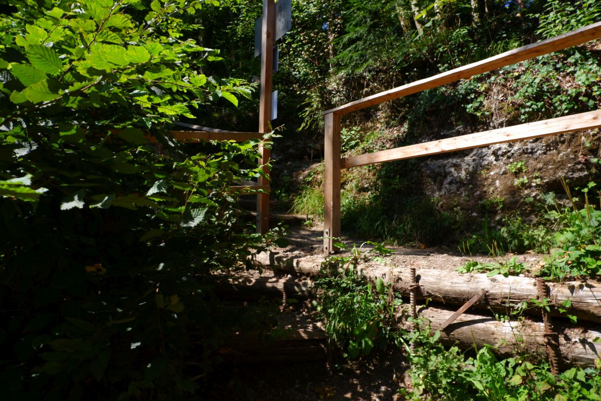 An einer Stelle wurde der weggebrochene Weg durch Holzstämme ersetzt. Gut, dass es hier auch ein Seil zum Festhalten gibt!