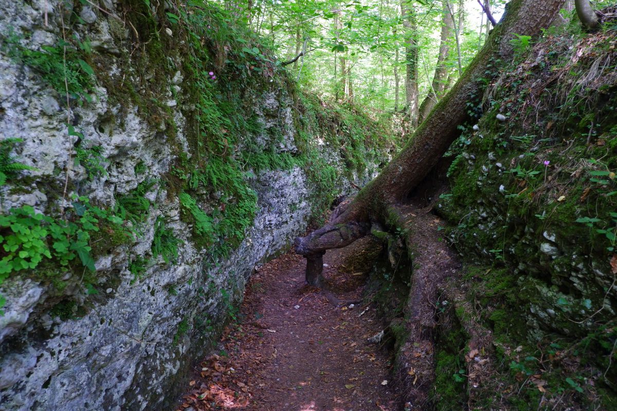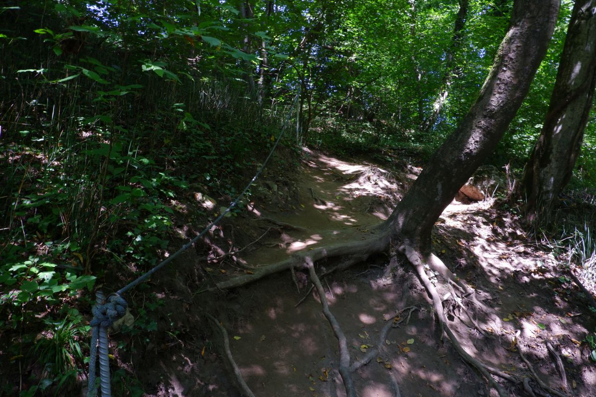 Über Wurzeln muss man sich dann wieder hochkämpfen. Hier gibt es glücklicherweise ein Stahlseil, an manchen Stellen muss man sich auch an Wurzeln oder Felsen festhalten.